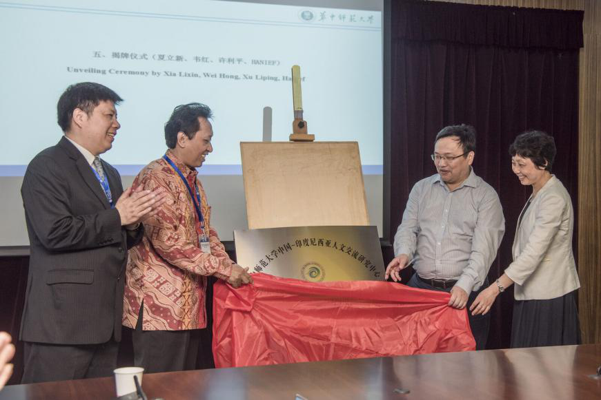 4月22日,中印尼人文交流研究中心揭牌仪式暨“一带一路”背景下中印尼人文交流研讨会在逸夫国际会议中心二楼会议室召开。印尼伊斯兰高校联盟主席汉尼夫教授、中国社科院亚太战略研究院许利平研究员、华中师范大学副校长夏立新、华中师范大学中印尼人文交流研究中心主任韦红共同为中心揭牌。国内各印尼研究中心负责人、我校相关职能部门负责人、中印尼人文交流研究中心全体人员参加。会议由我院副院长胡宗山主持。