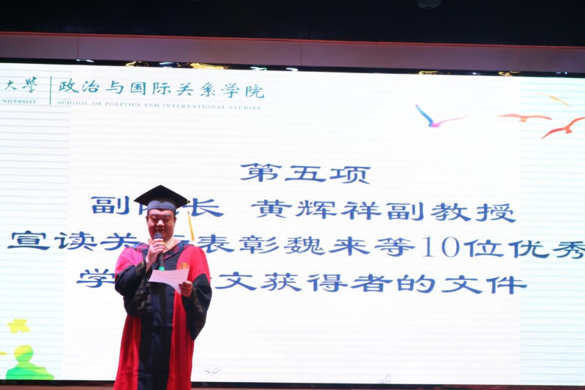 在毕业生代表发言环节中,国际政治专业本科生陈爽同学表达了对母校、对老师的培养之恩的感谢,并表示在今后的人生中将不忘初心,继续前进,成就更好的自己。中外政治制度专业硕士生董思遥同学向老师同学们表达了最诚挚的感谢和最衷心的祝福,并表示在以后的人生中将始终铭记学院领导和老师的教导,心怀“些小吾曹州县吏、一枝一叶总关情”的为民情怀,用实际行动来诠释属于政国人的担当,为扩大基层群众在生活层面和社会、思想方面的自由而努力。缅甸籍国际关系专业留学生朱银月同学用流利的中文表达了对中国的热爱和对学校、学院和老师们的感激与不舍。院友代表中共上海市委党校赵大朋副教授深情追忆了在桂子山的各种精彩经历,并结合自身的人生经历,勉励大家要敢于挑战、勇于突破,创造更多的可能性,成就精彩人生。