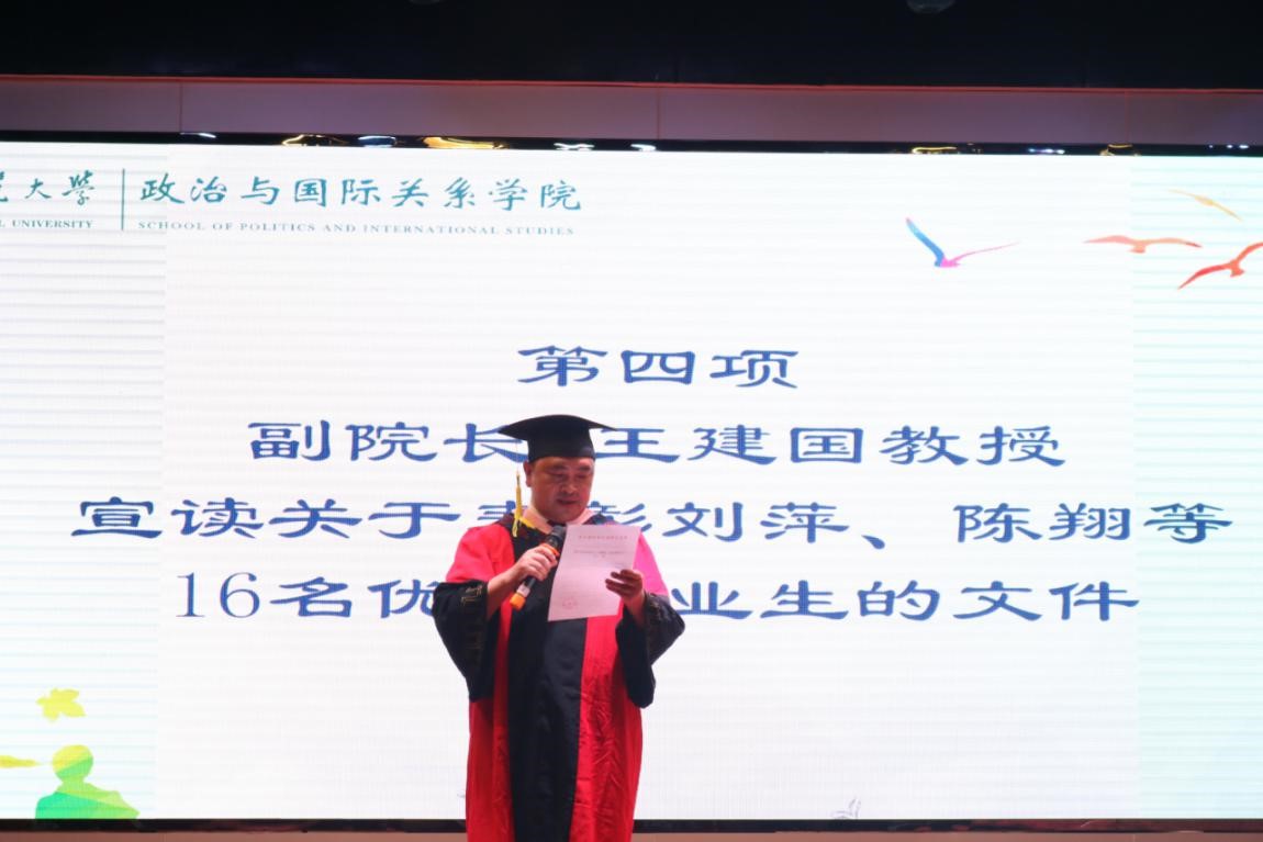 接下来,我院副院长王建国教授宣读了关于表彰刘萍、陈翔等16名优秀毕业生的文件,副院长黄辉祥副教授宣读了关于表彰魏来等10位优秀学位论文获得者的文件。我院领导为获奖代表颁奖。