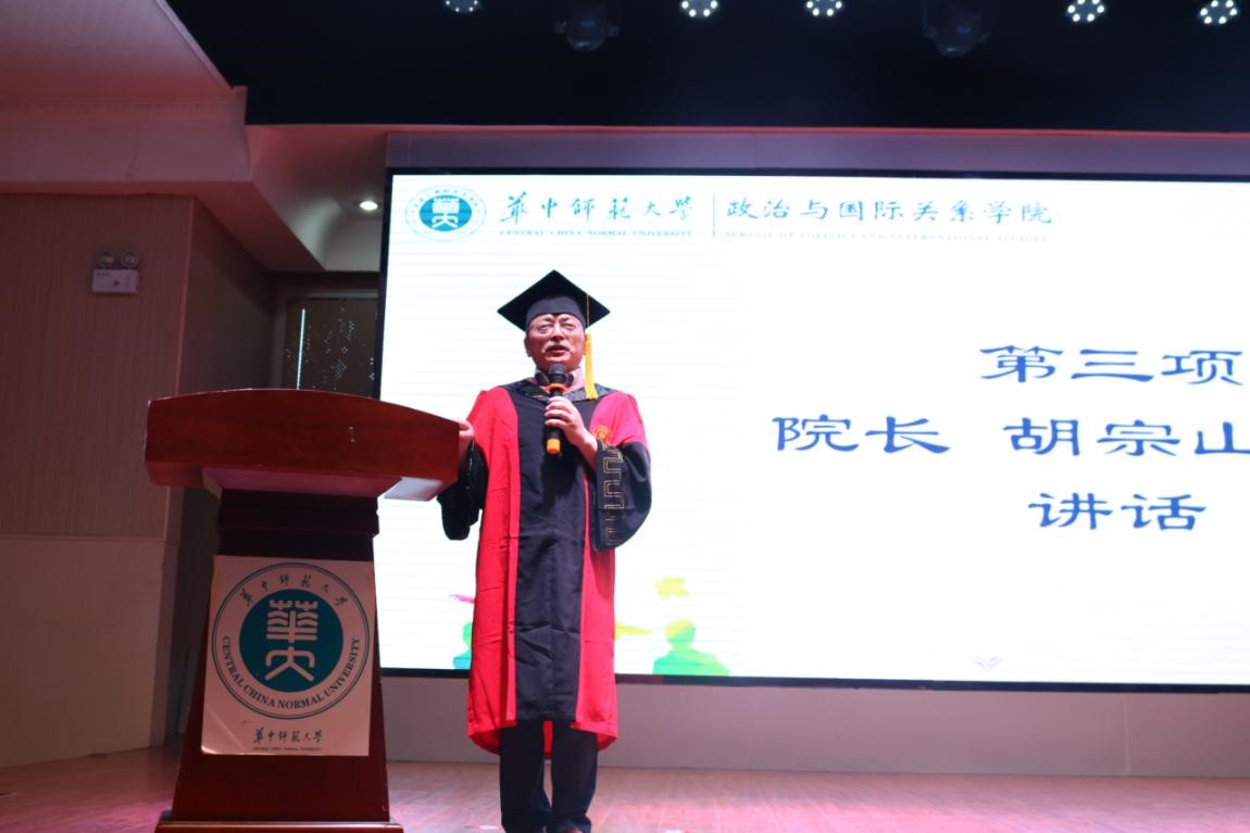 随后,我院院长胡宗山教授对本届全体毕业生表达了热烈的祝贺和衷心的祝福,并勉励大家不忘真心之初,做一个有用、有成就的人,不要虚度年华;不忘善心之初,做一个有情怀、肯奉献、高尚的人;不忘爱心之初,做一个好人,时刻坚守内心,成为有益于社会、有益于他人的人。