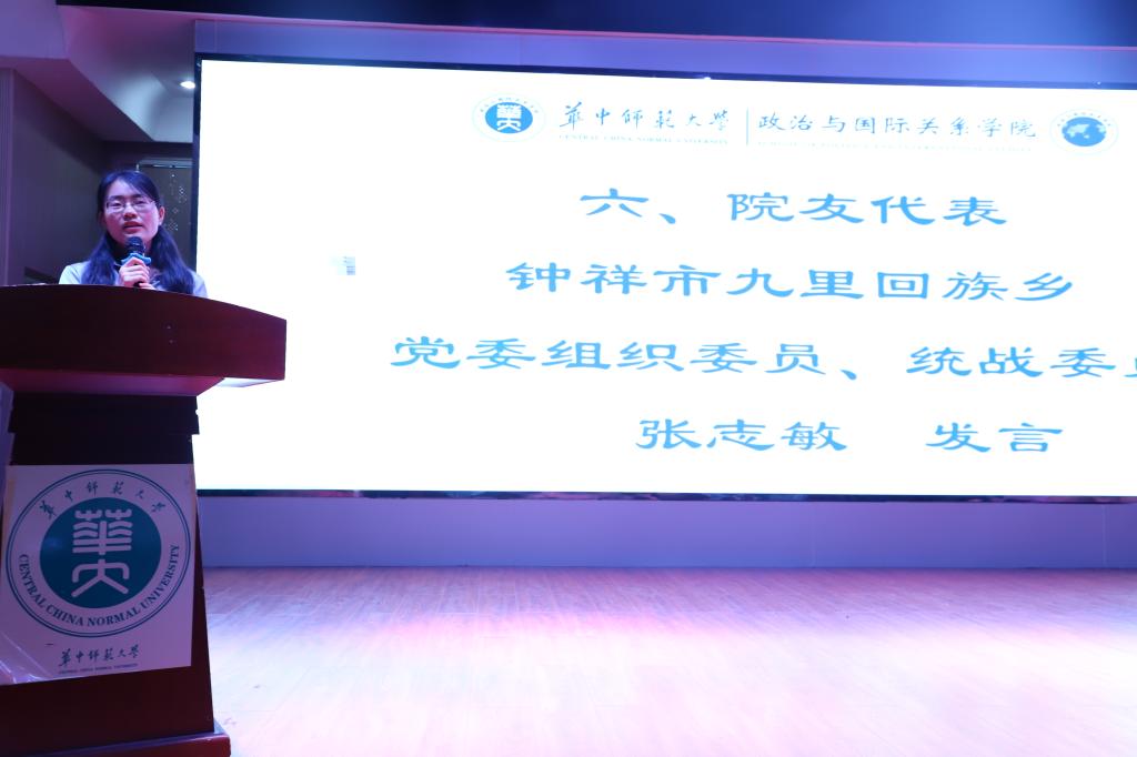 钟祥市九里回族乡委副乡长张志敏作为院友代表发言,她结合自己在基层的工作经验和体会,勉励同学们在未来的学习和生活中找准自己的定位,放下学历包袱,重新树立目标,知行合一,脚踏实地,朝着自己的目标艰苦奋斗,在实现人生理想的过程中绽放青春光彩。