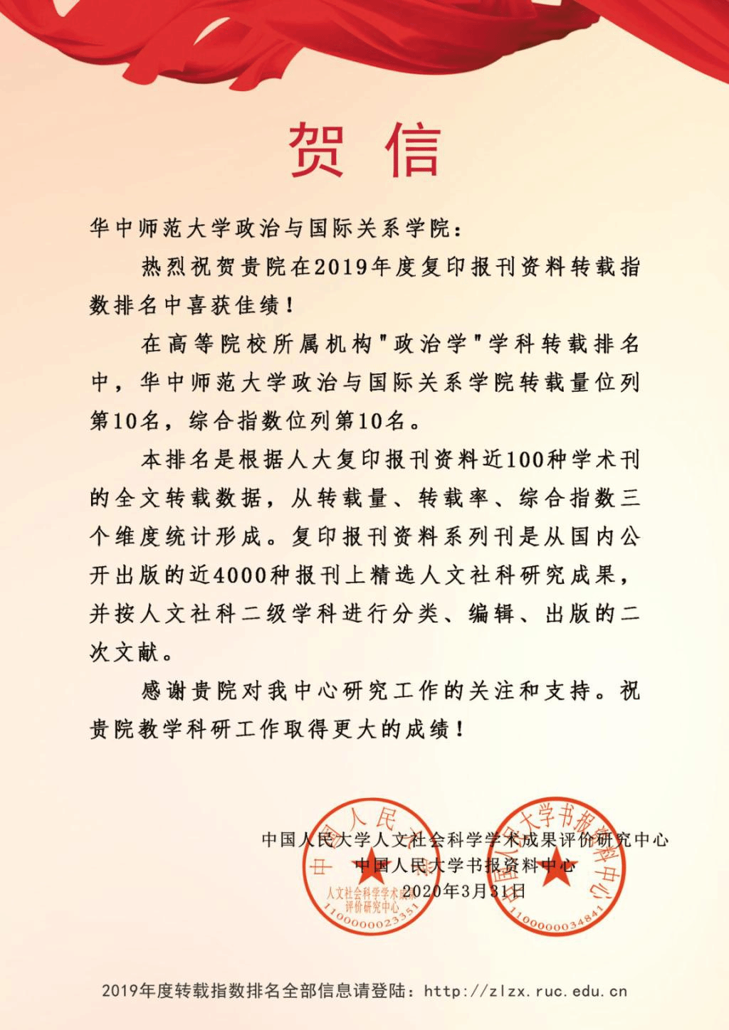 (通讯员 刘丹)3月31日,我院收到中国人民大学人文社会科学学术成果评价研究中心和中国人民大学书报资料中心联合发来的贺信,祝贺我院在2019年度复印报刊资料转载指数排名中喜获佳绩!