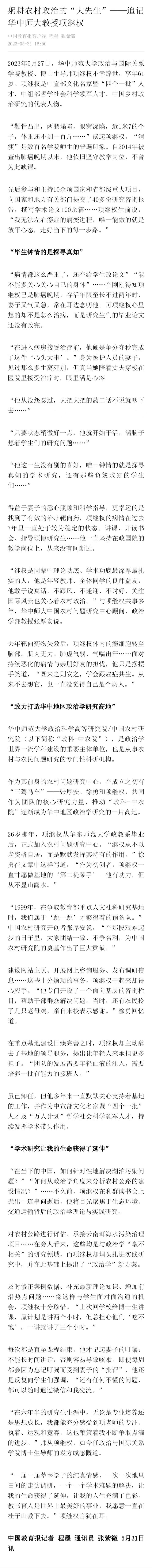 2023年5月27日,华中师范大学政治与国际关系学院教授、博士生导师项继权不幸辞世,享年61岁。项继权是中宣部文化名家暨“四个一批”人才,中组部哲学社会科学领军人才,中国乡村政治研究的代表人物。