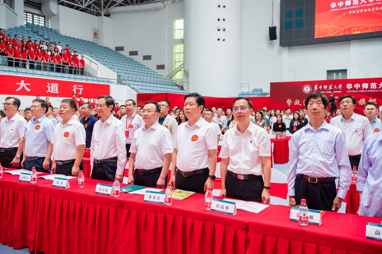 (通讯员 邱锐)四十余载育人春秋,执笔共绘学科画卷。6月23日,华中师范大学政治学校友会成立大会在佑铭体育馆举行。湖北省委宣传部常务副部长邓务贵、湖北省作家协会党组书记文坤斗、江汉大学党委书记覃道明、广东省贸促会一级巡视员白明韶、国务院发展研究中心网络舆情研究所副所长王守宽、湖北交通投资集团总法律顾问罗寿龙、湖北民族大学党委副书记邓磊、汉江师范学院副校长吴红斌、上海君合投资董事长陈谋亮,校党委书记夏立新、校党委副书记查道林、副校长彭南生,以及学校各职能部门和院系负责人、两院离退休教师、全体在校教职工和学生代表出席会议。来自全国各地的政治学(科学社会主义研究所、政治学研究院、政治与国际关系学院、中国农村研究院)校友团聚桂子山,共促政治学学科发展。大会由华中师范大学政治学校友会执行会长唐鸣主持,并通过线上平台同步直播。