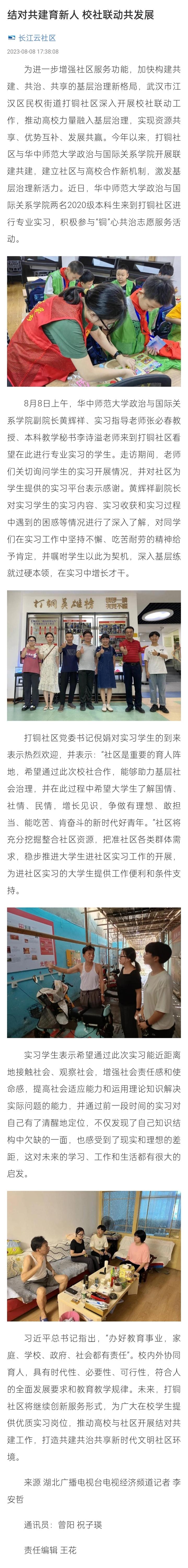 为进一步增强社区服务功能,加快构建共建、共治、共享的基层治理新格局,武汉市江汉区民权街道打铜社区深入开展校社联动工作,推动高校力量融入基层治理,实现资源共享、优势互补、发展共赢。今年以来,打铜社区与华中师范大学政治与国际关系学院开展联建共建,建立社区与高校合作新机制,激发基层治理新活力。近日,华中师范大学政治与国际关系学院两名2020级本科生来到打铜社区进行专业实习,积极参与“铜”心共治志愿服务活动。