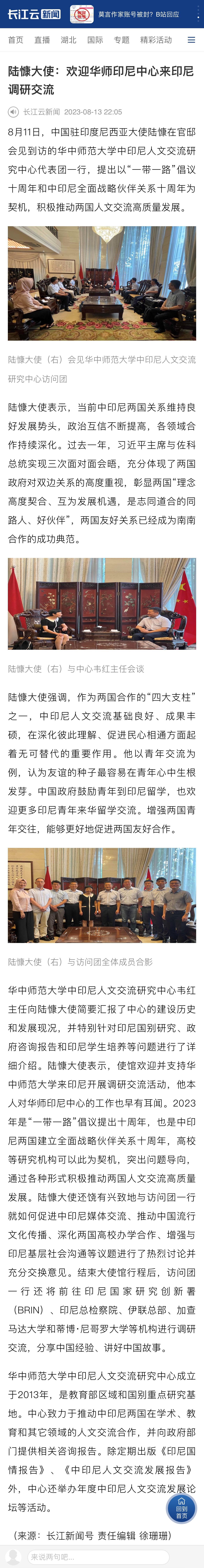 8月11日,中国驻印度尼西亚大使陆慷在官邸会见到访的华中师范大学中印尼人文交流研究中心代表团一行,提出以“一带一路”倡议十周年和中印尼全面战略伙伴关系十周年为契机,积极推动两国人文交流高质量发展。