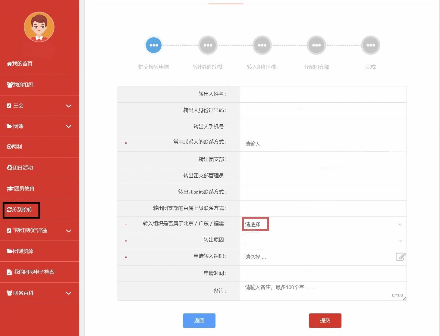 图表 1“智慧团建”个人转出申请页面