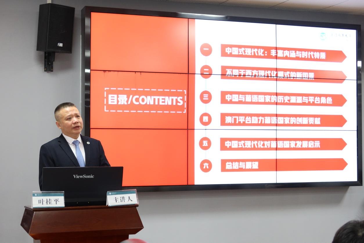 (通讯员 姜佳宜)“中国式现代化是在坚持中国共产党的领导和独立自主的基础上、具有鲜明的历史演进性的现代化,是百年成绩的深刻总结,是中华民族伟大复兴的必由之路,为世界现代化发展提供了中国智慧和中国经验。”11月28日上午,政国大讲堂系列讲座在文科科研楼1005会议室举行,澳门城市大学副校长、研究生院院长、葡语国家研究院院长、教授叶桂平在学院作了题为“中国式现代化对葡语国家人类文明新形态的创新性贡献”的学术讲座,国际所2023级硕士研究生参加,讲座由胡宗山院长主持。