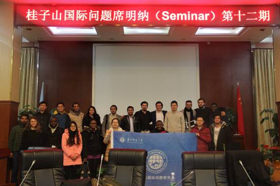 (通讯员 童宇)12月14日,桂子山国际问题研究会在老图书馆四楼模拟联合国实验室举办桂子山国际问题席明纳第十二期活动,活动主要围绕中国崛起和周边外交展开了研讨,此次受邀参与研讨的嘉宾是四位来自我校政治与国际关系学院国际关系专业的留学生:来自尼泊尔的博士生Dhruba Raj Adhikari 、来自孟加拉的博士生Mobarak Hossain、来自约旦的博士生Laith Khaled Almaani和来自智利的博士生Philippe Werner-Wildner。国际事务研究所赵长峰副教授受邀参加此次活动。