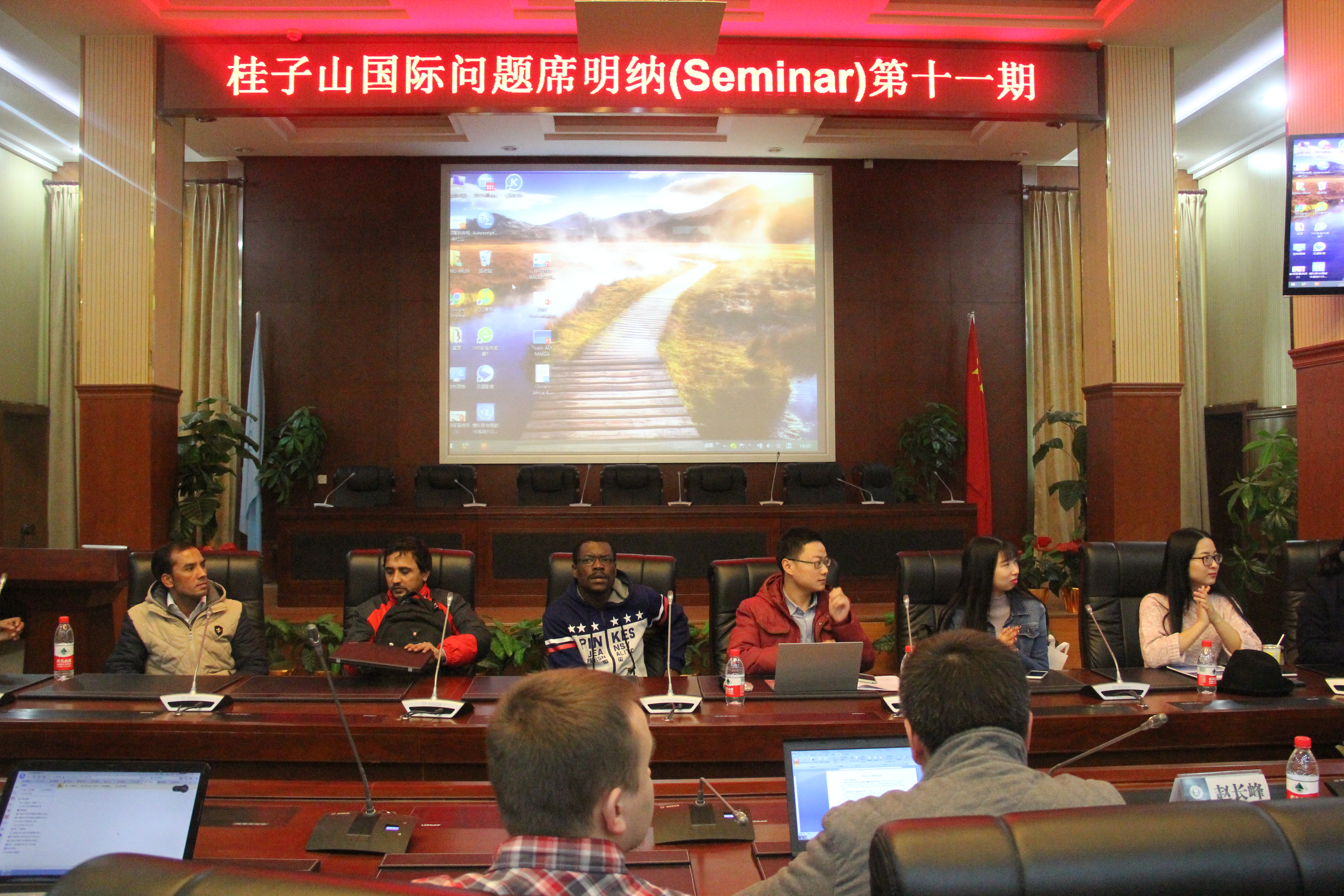 (通讯员 夏明慧)12月7日,桂子山国际问题研究会在老图书馆四楼模拟联合国实验室举办桂子山国际问题席明纳第十一期活动,活动主要围绕非洲问题展开了研讨,此次受邀参与研讨的嘉宾是四位来自我校政治与国际关系学院国际关系专业的留学生:来自刚果的博士Piaget Mpoto Balebo、来自马里的博士Maiga Aly、来自乌干达的博士Ssemanda Allawi和来自布隆迪的博士Alfred Burimaso。国际事务研究所赵长峰副教授、张弦老师也受邀参加此次活动。