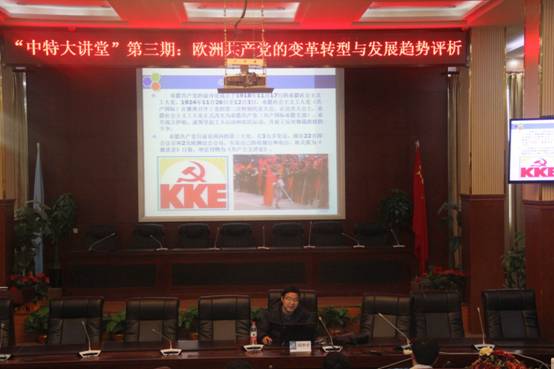 (通讯员 张德林 )11月26日下午,由政治与国际关系学院中国特色社会主义理论协会主办的第三期“中特大讲堂”在模拟联合国开讲。本次中特协会邀请到了国外马克思政党研究中心的周华平副教授作为演讲嘉宾,他与在场的70余名研究生和本科生就“欧洲共产党的变革与发展”的话题展开了讨论。