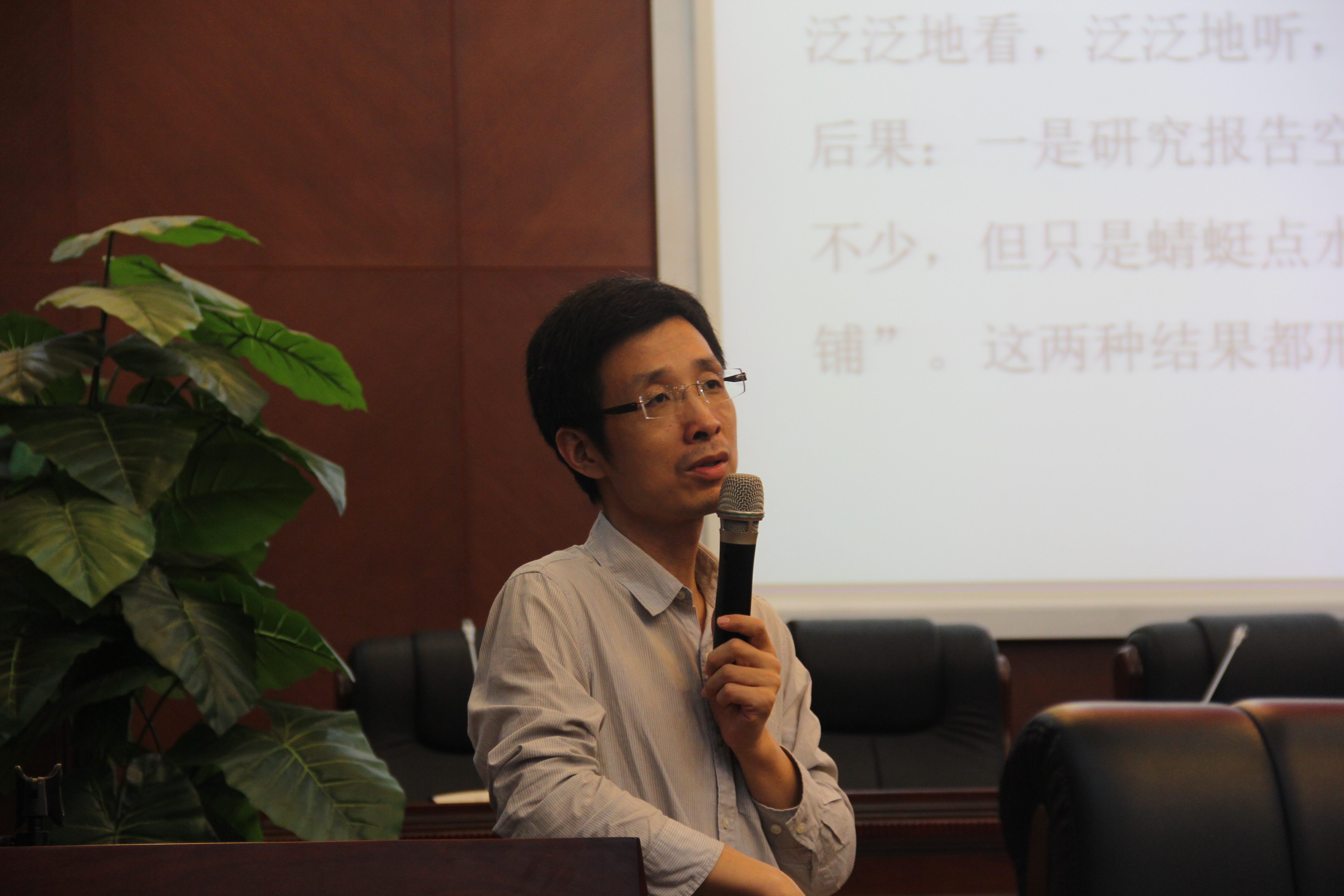 袁老师运用案例、亲身经历深入浅出、生动形象地讲解了农村调查的方法。讲授内容主要由两部分组成:农村调查的一般程序和一般方法。首先,袁老师就农村调查的一般程序做了详细讲解,他指出,农村调查的一般程序包括选题阶段、准备阶段、调查阶段、研究阶段和总结阶段。选题很关键,选题应遵循“小清新”原则:选题要小、要清、要新。准备阶段包括组织队伍、设计方案和准备物资。调查阶段包括进入调查地点、进行调查和收集资料。在研究阶段,要掌握技巧,提前准备,学会追问,从而形成文字材料,随之进行整理和统计分析。总结阶段,包括工作总结和形成调查成果——调查报告。