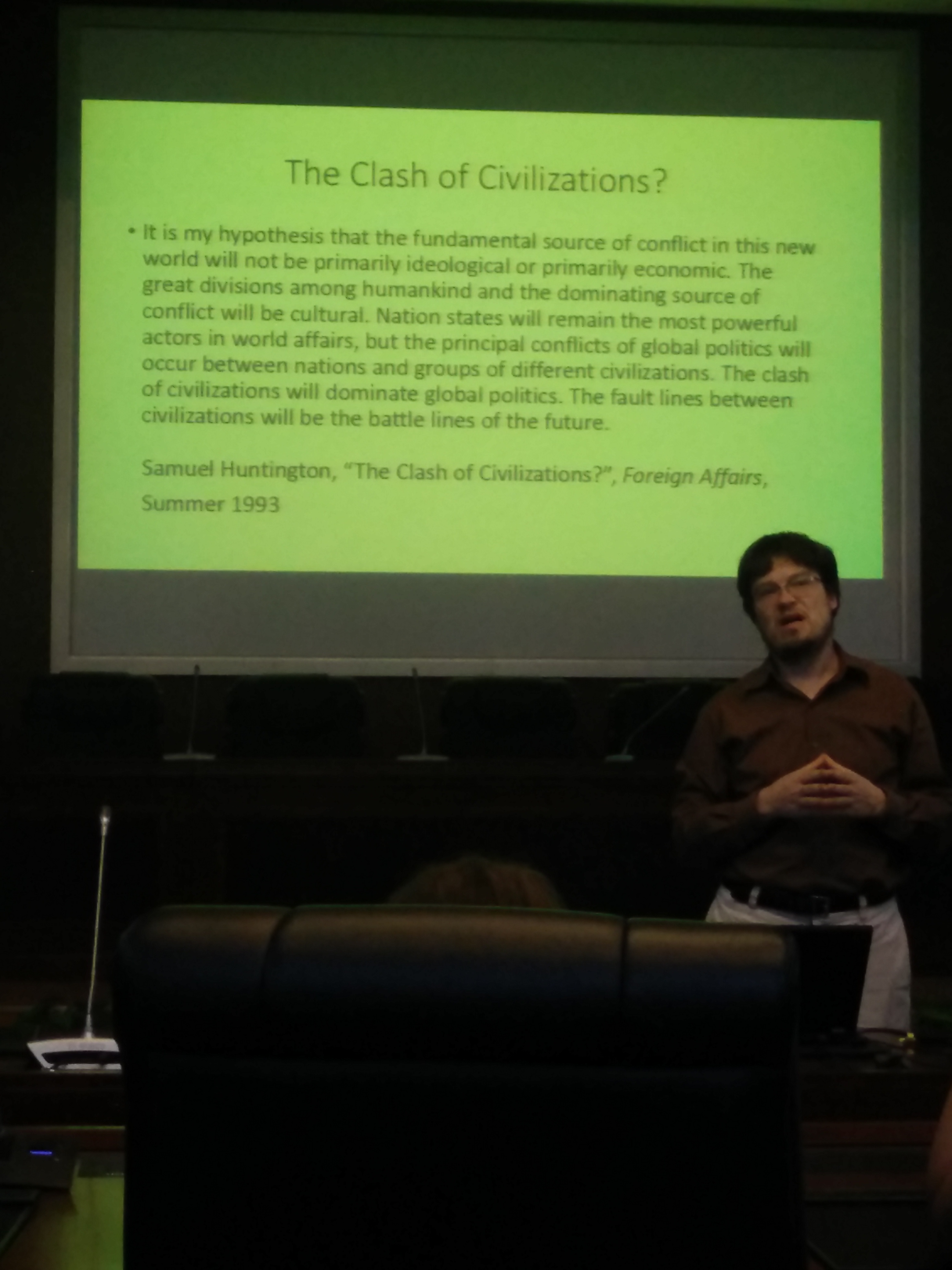 本周课程由来自美国麻省大学波士顿分校的张务和阿巴拉契亚州立大学AleKsander Lust两位教授共同讲授,总计20个课时,共有包括国际事务研究所16级全体中外方硕、博士研究生在内的近200人参加。张务教授首先概述了美国学术界对于政治学学科的认知,接着介绍了中国政治研究的现况,并通过比较中、西政治哲学与政治制度的异同,对中国崛起及其对世界的影响进行了深入分析和探讨;Lust教授则以正在进行的美国总统大选作为切入点,介绍了总统选举的现状及美国外交政策的发展。接着,他将视线转移到欧洲,就欧盟发展历史及英国脱欧带来的冲击进行了讲解和分析,并探讨了欧亚经济联盟的前景以及可能遇到的挑战。最后,Lust教授结合史实讨论了亨廷顿(SamuelP. Huntington)的“文明冲突论”,就其观点在21世纪的适用性与在座学生进行了热烈交流。两位教授治学严谨但又亲切风趣,授课注重启发互动,课堂气氛十分活跃,给同学们留下了深刻的印象,获得大家的一致好评。