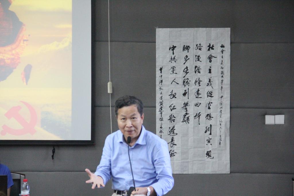 程毅教授对社会主义的发展演变史作了详细发言,尤其对中苏关系进行了分析;成带云教授作了《屹立在世界上的鲜艳红旗》主题讲话,表示要坚定不移地坚持中国共产党的领导;张永健教授用三句话高度概括中国共产党的发展史,“社会主义从空想到实现,路漫漫修远曲折,脚步步胜利攀巅”;刘兴策教授朗诵诗歌《我对党说》,情到深处时,声音哽咽,与会人员无不为之动容。
