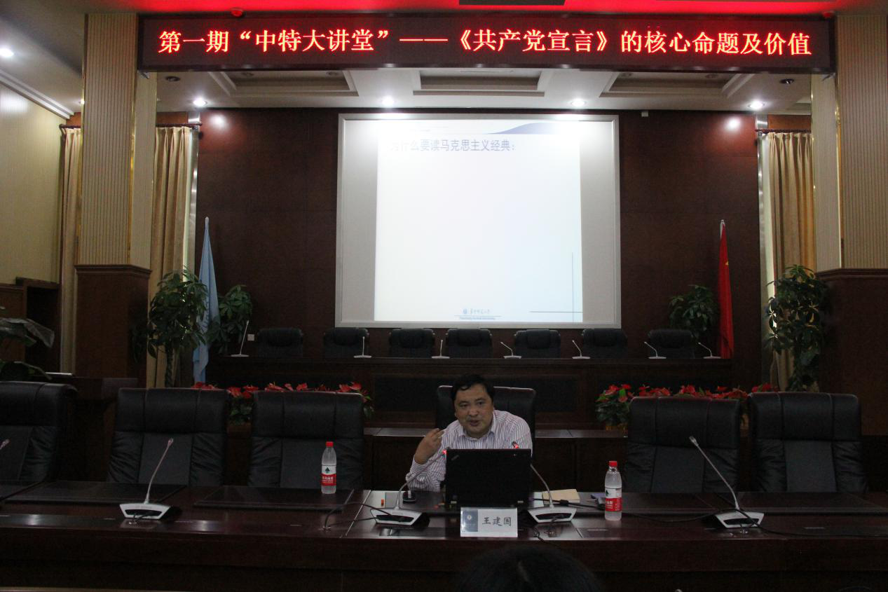 (通讯员 苗怡文)4月22日,为响应国家主席习近平“两学一做”——学党章党规,学系列讲话,做合格党员的号召,华中师范大学中国特色社会主义研究会在老图书馆四楼模拟联合国实验室举办第一期“中特大讲堂”活动,本次讲座邀请了华中师范大学政治学研究院王建国教授为大家主讲经典著作《共产党宣言》的核心命题及其价值。现场一百多名学生聆听此次讲座,取得了良好的反响。