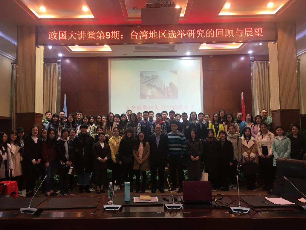 李宗义老师结合自己的学习经历,谈到要从台湾社会背景了解台湾政治生态,了解台湾选举政治最好的方式就是去研究选举如何渗透到台湾民众心中,李老师向各位承诺,今后会吸引更多台湾地区研究政治学的专家学者来我院讲学,助力一流学科建设。讲座最后,大家合影留念,为陈教授本次学术之旅划上了圆满的句号。