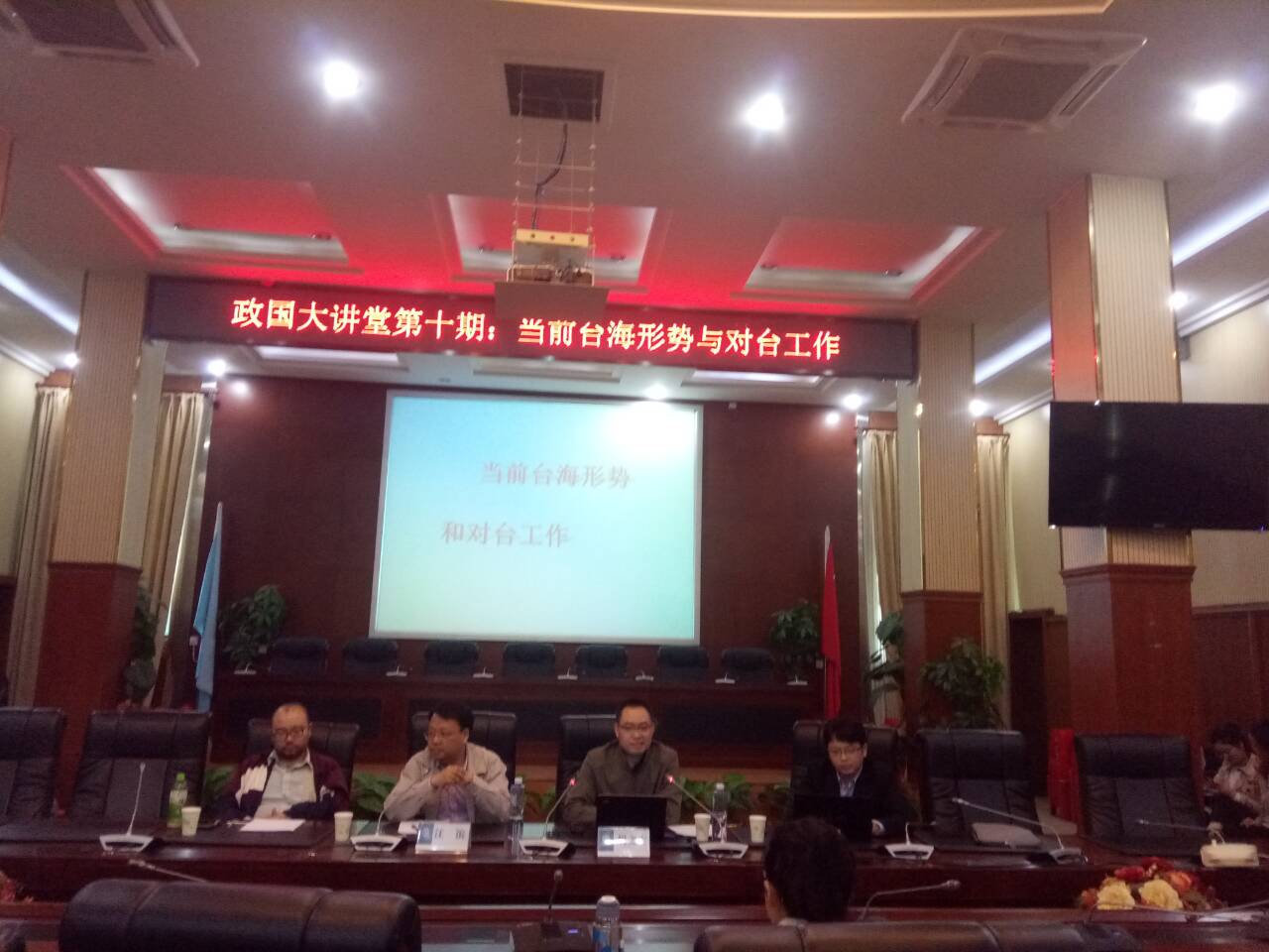 讲座开始后,胡教授首先就大陆与台湾目前的状况做了简要的预估——形势紧张且日趋严峻是其突出表现。随后,胡教授结合自己的工作经历和蔡英文当局的执政情况对台湾的现状进行了分析,他讲到,目前民进党的支持率每况愈下,同时国民党也内外交困、危机重重。虽然我们面对的是如此复杂严峻的形势,但在以习近平同志为核心的党中央领导下,始终坚持一个中国的原则,扎实推进工作,妥善应对变局,那么我们对台工作就一定会取得积极进展。