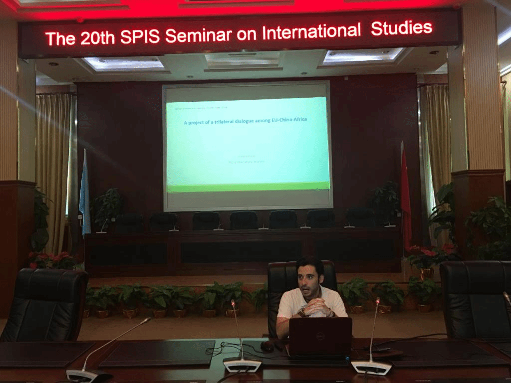 第一位主讲人是来自葡萄牙的André Almeida,他演讲的主题“中国-欧盟-非洲之间的三方对话机制”。他首先从经济学的视角出发分析了中国、欧盟与非洲三方合作的可能,紧接着为大家简单介绍了欧盟与非洲,中国与非洲这两个双边关系的发展历史并分析了中国、欧盟与非洲三方在多边关系中的利益关切与政策走向。最后他指出中国-欧盟-非洲三方合作机制虽然进展缓慢,但各方的共同利益远远大于彼此之间的分歧,三方应摒弃零和思维,共商共建,共赢共享。