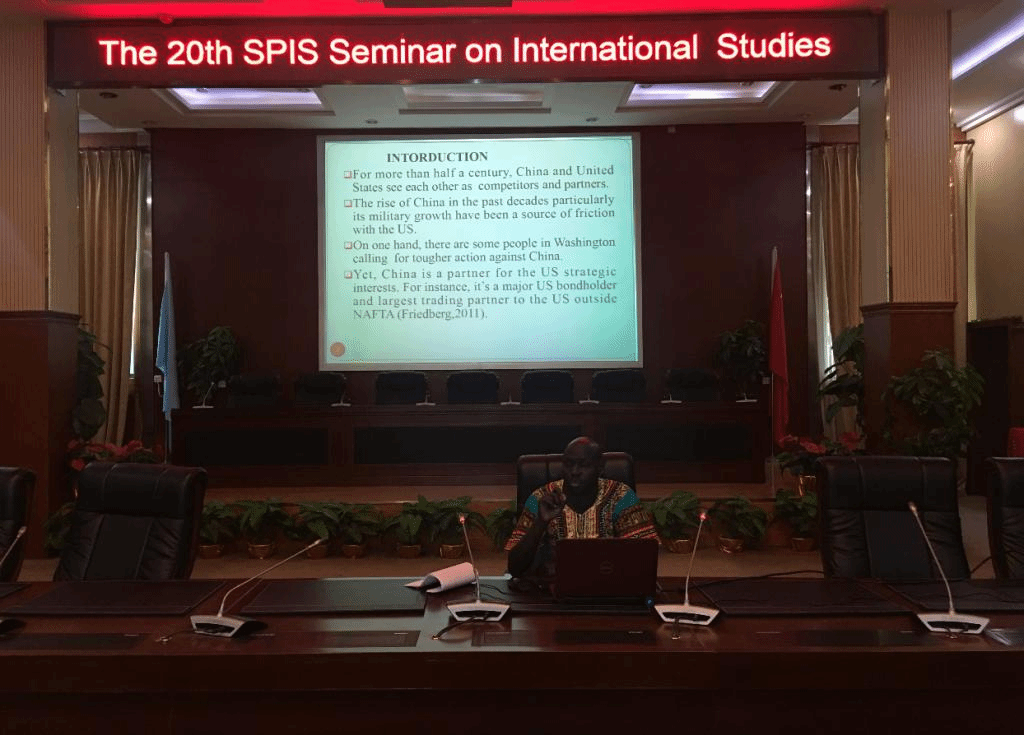 第二位主讲人是来自埃塞俄比亚的Kijak Okok。他报告的主题是“美国亚太再平衡战略:是否主要针对中国”。他首先就时任美国总统奥巴马提出亚太再平衡战略的背景尤其是中美之间的实力对比与国际地位进行了介绍和分析,紧接着对奥巴马、特朗普两任美国总统的亚太政策的演变进行了分析。最后,他指出中美之间竞争与合作长期存在,而中国的崛起和美国的相对衰落已经影响到了美国在全球尤其是亚太地区的利益,针对中美之间的世界权力转移的趋势,而亚太再平衡战略就是美国为巩固其世界唯一超级大国的地位的结果。