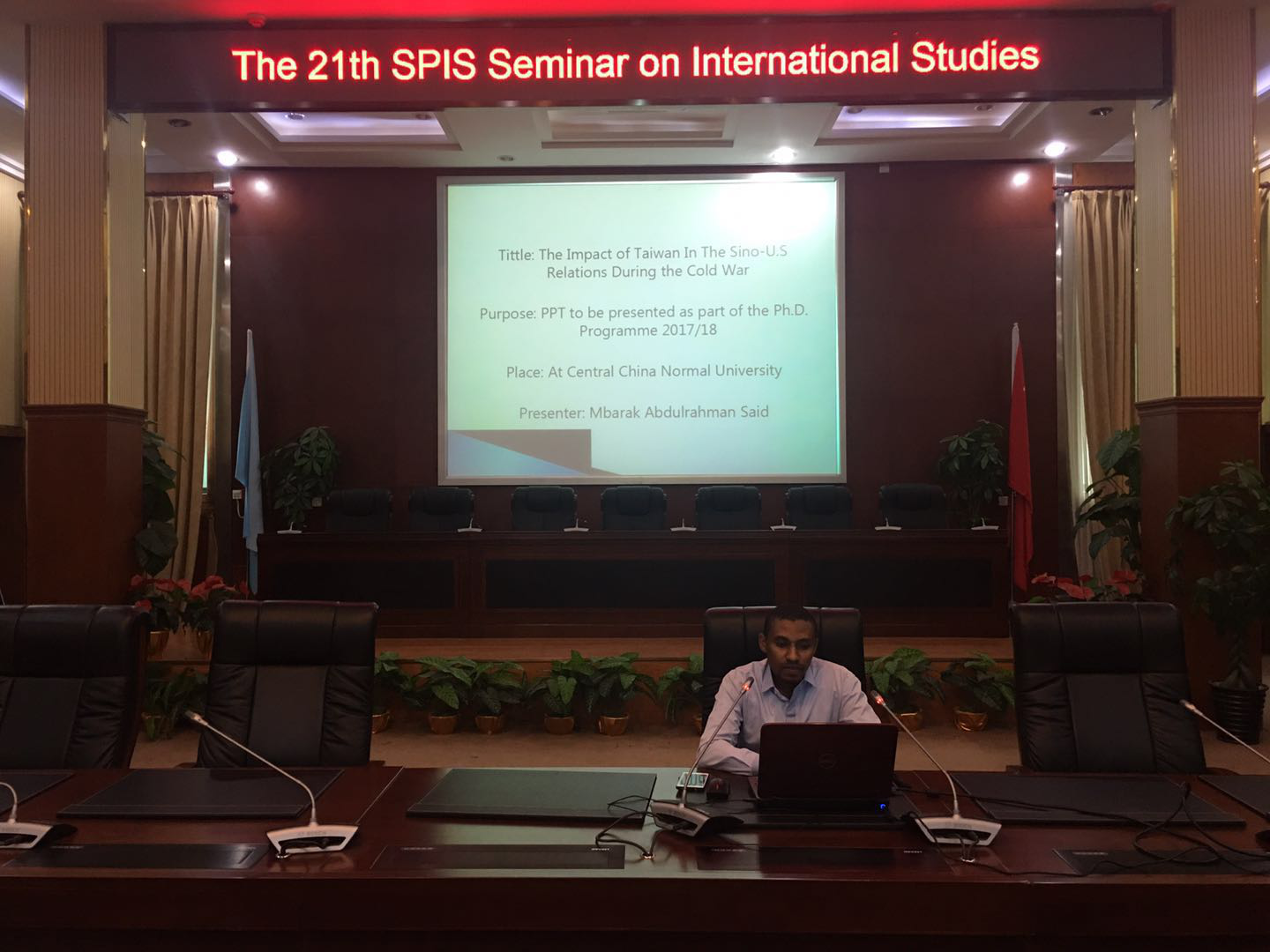 第三位主讲人是来自坦桑尼亚的Mbarak Abdulrahman Said,他报告的主题是“冷战时期中美关系中的台湾因素”。他首先就意识形态和中美三个联合公报出发对冷战时期中美关系由对峙走向缓和进行了简单介绍。其次就冷战时期中国大陆、美国和台湾地区的外交政策进行了解读,最后他结合现实,就台海局势对中美关系的发展进行了展望。