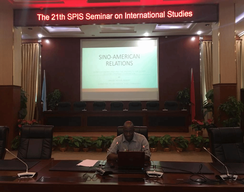 第一位主讲人是来自加纳的Yakubu Adjuik Robert,他演讲的主题“中美关系——中国的崛起和中美合作的前景”。他首先从大量的文献分析出发,对中美关系的发展历史与理论基础进行了介绍。接着就中国的崛起和中国崛起是美国的威胁等问题同大家进行了探讨,最后他指出全球化时代的来临加深了中美之间的彼此依赖性,中美双方应该摒弃零和思维,谋求合作共赢。