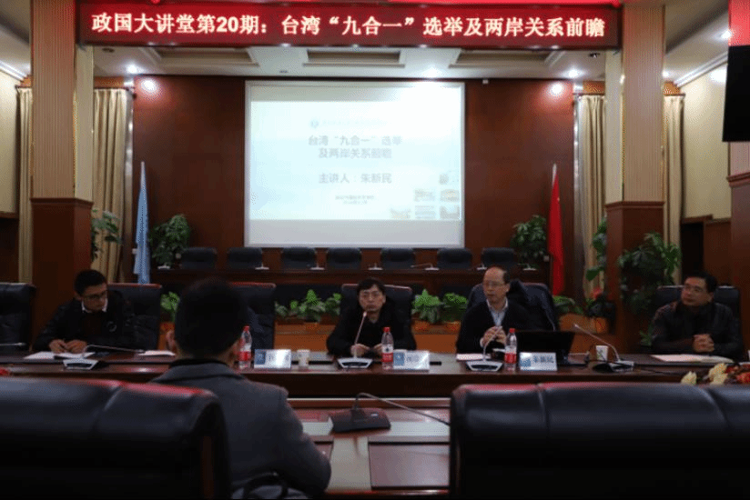(通讯员 叶春霞)2018年12月5日晚19:00,第20期政国大讲堂在模拟联合国会议室正式开讲。本次我院邀请到台湾政治大学外交学系朱新民教授为同学们带来主题为“台湾‘九合一’选举及两岸关系前瞻”的讲座。本次讲座由政治与国际关系学院副院长胡宗山教授主持,国际文化交流学院党委书记王琍研究员,台湾与东亚研究中心副主任彭韬研究员,台湾与东亚研究中心副主任汪滨老师出席了本次讲座,我院众多学生聆听了本次讲座。