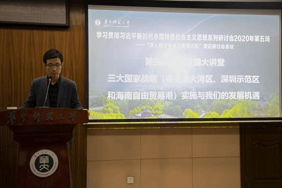 钟坚教授从各个方面谈了三大国家战略实施与我们的发展机遇,经济上,粤港澳大湾区对标国际上知名的纽约湾区、旧金山湾区、东京湾区,力争产业再次升级,提高产品附加值。政治上,深圳示范区探索社会主义的具体实现方式,为中国全面建成社会主义寻求方向。国际上,要发挥海南的地理优势,建设海南自由贸易港成为大型国际商业、金融中心。
