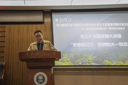 (通讯员:吴港婷)2020年10月16日晚,逸夫国际会议中心一楼报告厅展开了华中师范大学政治与国际关系学院学习贯彻习近平新时代中国特色社会主义思想系列研讨会2020年第五场——深入推进省域治理现代化理论研讨会会议分会场讲座“梦想的幻灭:欧洲的大一统悲剧”,本次讲座主讲人为清华大学教授任剑涛,主持人为我院袁方成教授,2019级国际所、政治所研究生和2020级国际所、政治所研究生参加了本次讲座。