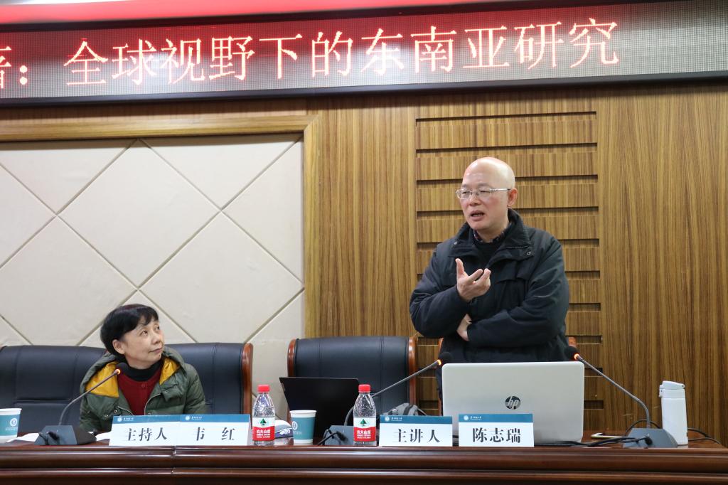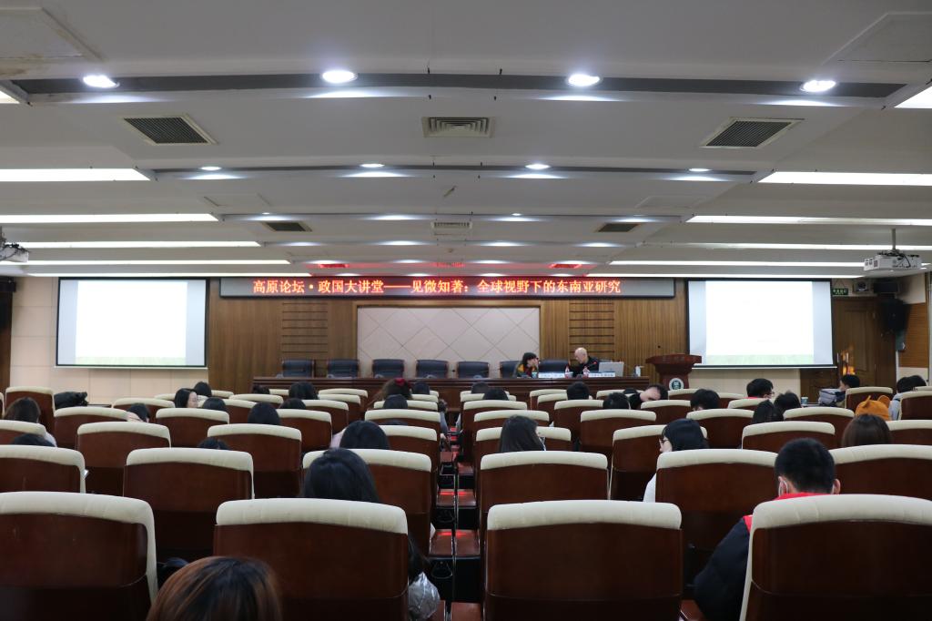(通讯员&摄影 戴程娟)2020年12月21日上午,高原论坛·政国大讲堂第四十四期在逸夫国际会议中心一楼报告厅举行。中国国际关系知名期刊《外交评论》执行主编、外交学院陈志瑞教授应邀莅临我院讲学交流,为政国学子们带来了以“见微知著:全球视野下的东南亚研究”为主题的讲座。本次讲座由我院韦红教授主持,陈菲副教授和汪滨副教授出席,2019级国际所以及2020级政治所、国际所研究生参加了本次讲座。
