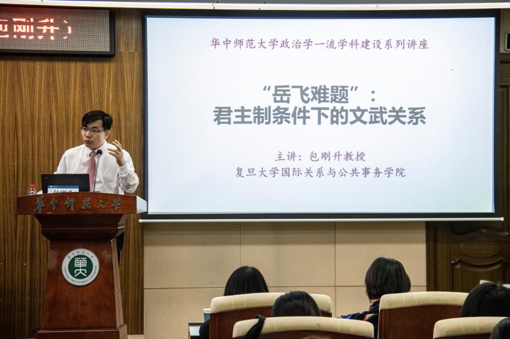 (通讯员:戴程娟)为扎实推进华中师范大学政治学世界一流学科建设,提高学生的学术思维与能力,政治与国际关系学院(以下简称:政国院)邀请了复旦大学包刚升教授为同学们带来题为“岳飞难题:君主制条件下的文武关系”的学术讲座。本次讲座于2021年5月6日晚在逸夫国际会议中心一楼报告厅举行,政国院袁方成教授主持了本次讲座。