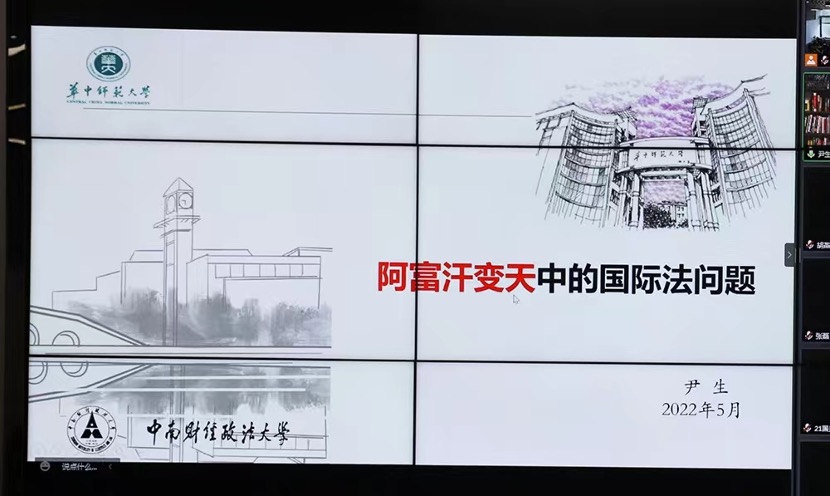 (通讯员:王伏林)5月24日下午,政治与国际关系学院(以下简称“政国院”)“国际政治名家讲坛”2022年第五期在政国院313会议室顺利举办。中南财经政法大学尹生教授在线上作了题为“阿富汗‘变天’中的国际法问题”的学术讲座,本次讲座由国际政治团队戴轶教授主持,国际政治专业2020级硕士生在政治与国际关系关于313会议室集中聆听,线上参与的本硕博同学有50余人。