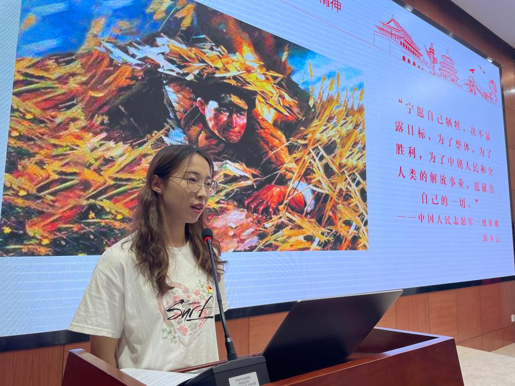 活动第二项,关静娴、肖溪、赵晓婷三位同志分别分享了抗美援朝战场上,杨根思、黄继光、邱少云三位英雄人物的光荣事迹。三位英雄人物在战场上因为不同的原因献出自己的宝贵生命,但他们却有一个共同的目标——保家卫国、反抗侵略!三位同志在分享感悟时纷纷表示:英雄人物永远值得被铭记,英雄精神必须要世代弘扬!我们作为新时代的青年,享受着革命先烈们用血汗为我们打拼来的幸福生活的同时,必须发奋图强努力成为有理想、有本领、有担当,实践、实用、实干的优秀人才,为实现中华民族伟大复兴的宏图伟业贡献青春力量!
