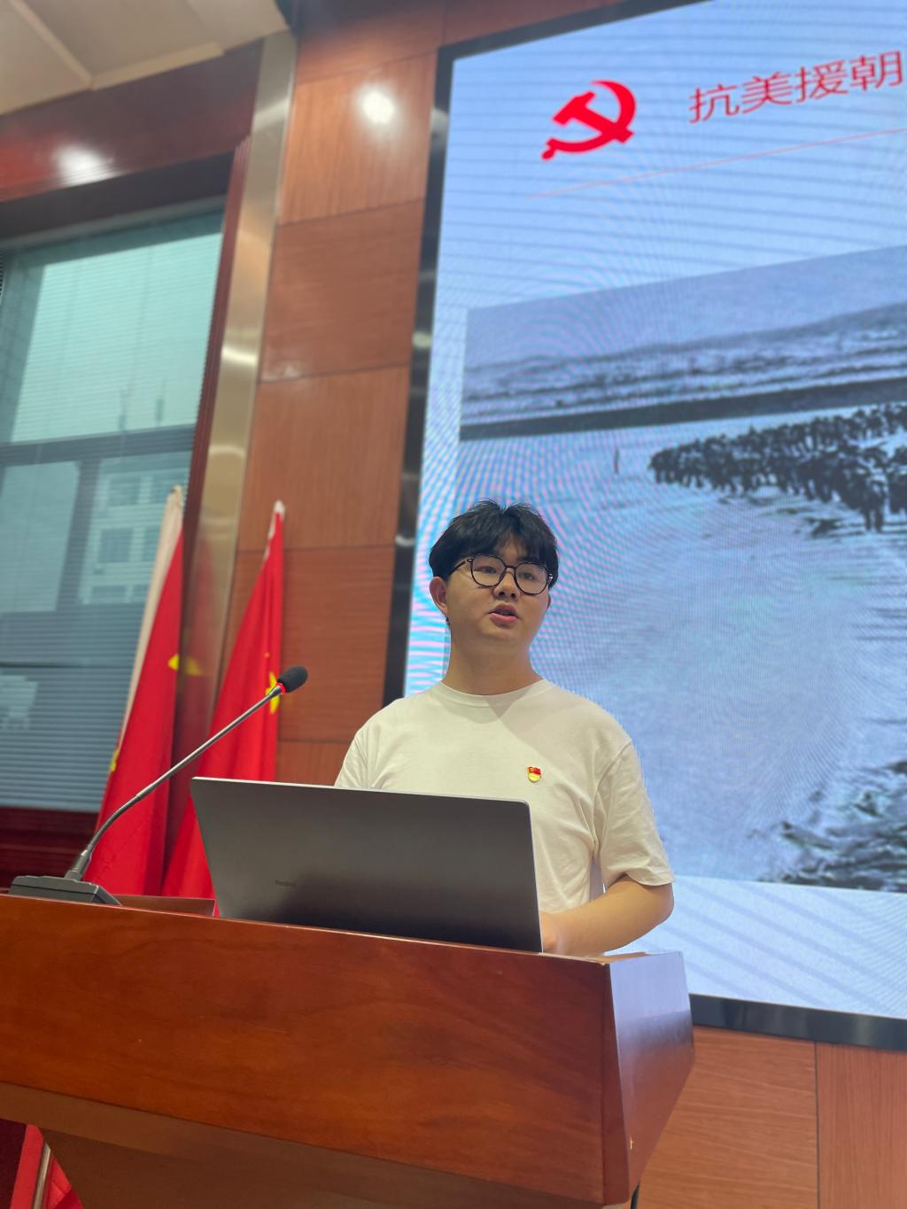 接着,邓俊豪同志向大家介绍了抗美援朝战争爆发的原因和经过。邓俊豪同志表示:在抗美援朝战争期间,党中央统揽全局,实施有力的战争动员和正确的战争指导,采取边打、边稳、边建的方针,开展了波澜壮阔的抗美援朝运动,全国各族人民举国同心支撑起这场事关国家和民族前途命运的伟大抗争,最终用伟大胜利向世界宣告“西方侵略者几百年来只要在东方一个海岸上架起几尊大炮就可霸占一个国家的时代是一去不复返了”!