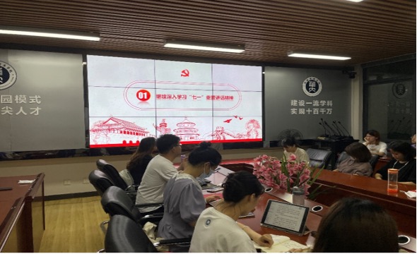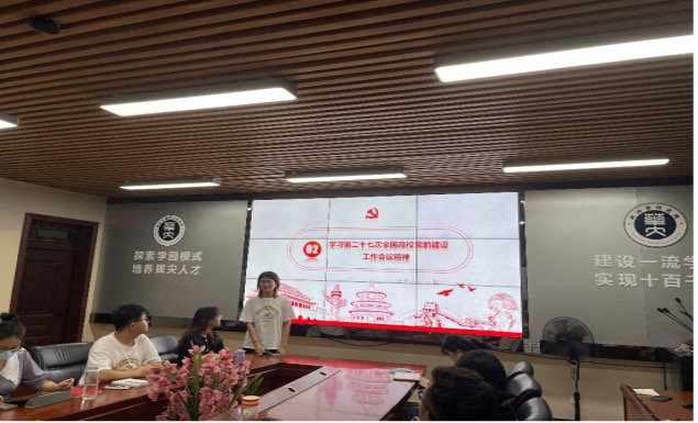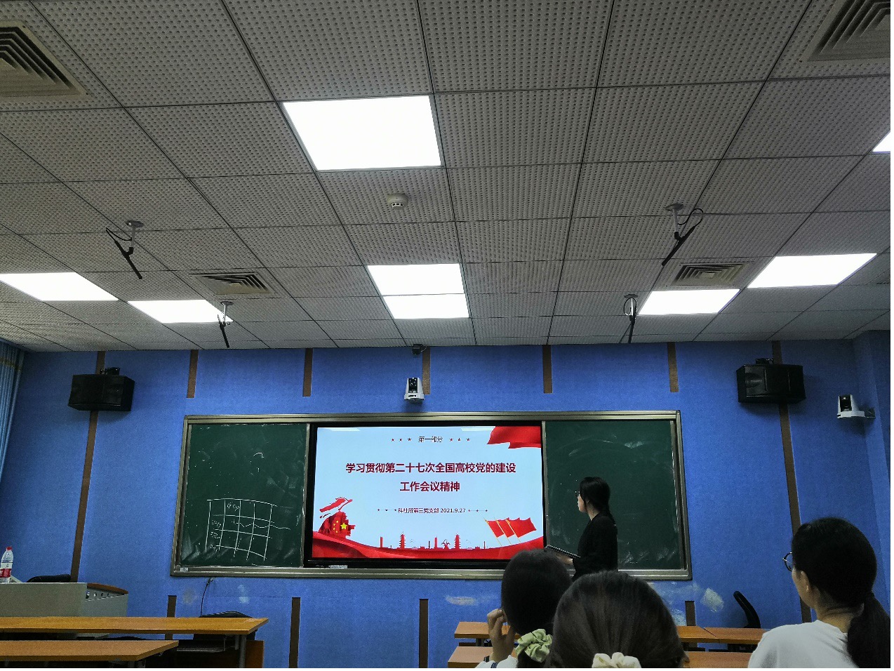 会上传达学习了中共中央政治局常委、中央书记处书记王沪宁在第二十七次全国高校党的建设工作会议上的讲话精神。一要深入学习贯彻习近平总书记“七一”重要讲话精神和关于加强高校党建工作的重要论述,坚定“四个自信”、做到“两个维护”,提高政治判断力、政治领悟力、政治执行力,牢记“国之大者”。二要贯彻落实《中国共产党普通高等学校基层组织工作条例》,学校要把疫情防控摆在突出位置,落实防疫条件和常态化防控措施,全体党员都要增强防疫意识,主动配合学校的各项防疫政策。