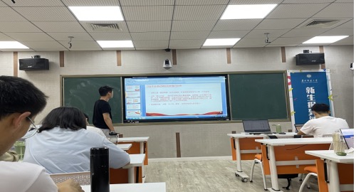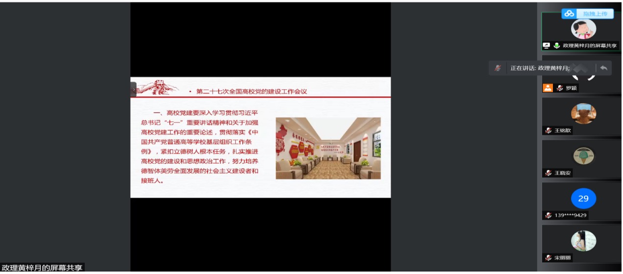 首先由洪世强同志带领大家学习第二十七次全国高校党的建设工作会议精神,他以思维导图的方式展示了高校党建和思想政治工作进展成效。带领大家学习了人民日报、光明日报和新华社关于此次会议的相关文章的点评要点,同志们意识到当前需要培养堪当民族复兴的时代新人;需要坚定政治信仰;聚焦重点并要以德服人。