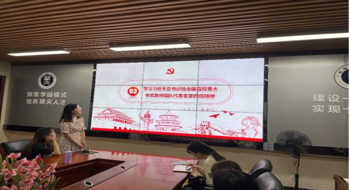 会议的第二部分是全体党员针对第三十七个教师节之际习近平总书记给全国高校黄大年式教师团队代表回信的学习和研讨。习近平总书记强调,好老师要做到学为人师、行为世范。师范类高校的师生应学习弘扬黄大年同志等优秀教师的高尚精神,同全国高校广大师生一道立德修身,潜心治学,开拓创新,真正把为学、为事、为人统一起来,当好学生成长的引路人,为培养德智体美劳全面发展的社会主义建设者和接班人、全面建设社会主义现代化国家不断作出新贡献。赓续百年初心、弘扬建党精神,切实担当为党育人、为国育才的光荣使命。
