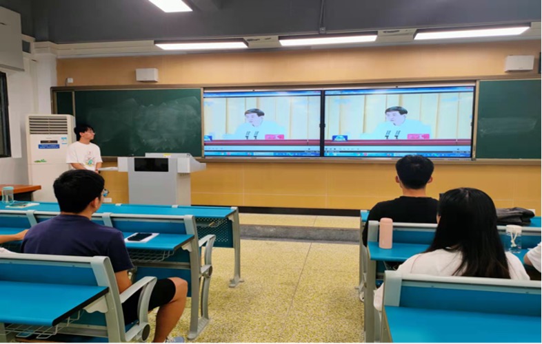 活动进入第一项,由邓俊豪同志带领大家继续深入学习习近平总书记“七一”重要讲话精神。首先,邓俊豪同志为大家播放了庆祝中国共产党成立100周年大会上共青团员和少先队员代表集体致献词的视频,四位状态饱满的领诵员和各位共青团员和少先队员铿锵的话语,再次将支部成员带入那场庄严又令人自豪的大会现场,视频放映结束后,同志们不禁纷纷鼓掌表示赞叹。接着,邓俊豪同志强调,习近平总书记“七一”重要讲话紧紧围绕实现中华民族伟大复兴这个主题,充满着对党的历史的无比珍视、对党的事业的无比自信,具有极为重要的政治意义、理论意义、实践意义,需要我们反复学习、认真感悟、深刻把握。