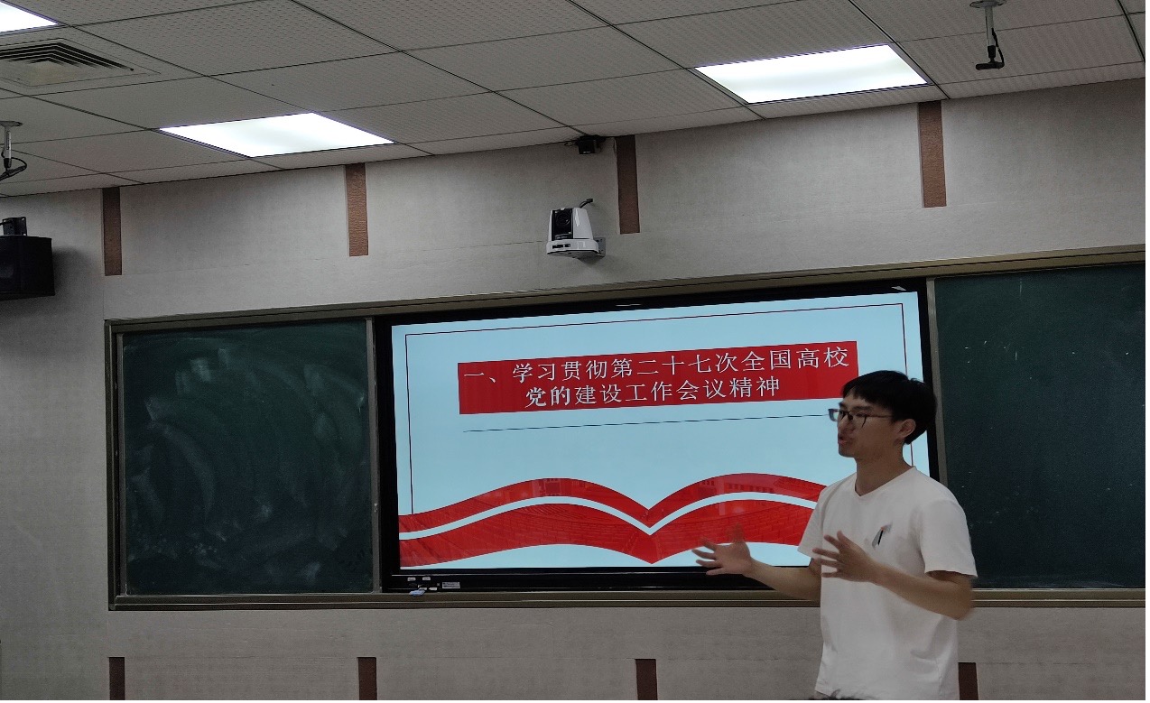 彭波同志作为新一批预备党员,领学第二十七次全国高校党的建设工作会议精神,他在主要从概要、相关精神以及进展成效综述三个方面展开。他先是以中共中央政治局常委、中央书记处书记王沪宁的话引出话题,强调高校党建的重要性;其次引领同学们深入了解习近平总书记“七一”重要讲话及关于加强高校党建工作的重要论述;最后以北京理工大学、哈尔滨工业大学等学校例子展现出当今高校党建的硕果,展现出思想政治工作需与时代同频共振。