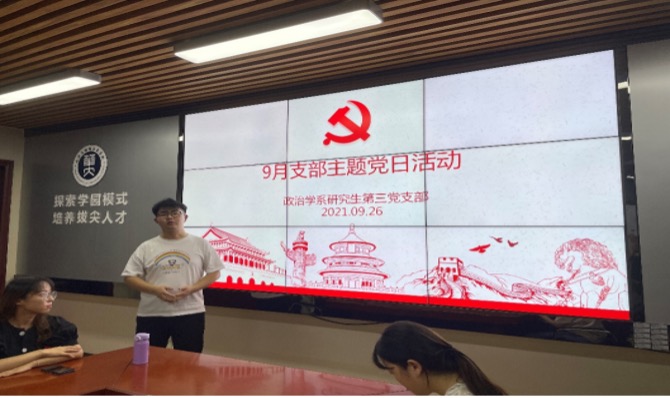 2021年9月26日晚,政治学系研究生第三党支部在学院313会议室开展了9月主题党日活动。本次主题党日活动的议程为:一、继续深入学习习近平总书记“七一”重要讲话精神;二、学习第二十七次全国高校党的建设工作会议精神;三、学习习近平总书记给全国高校黄大年式教师团队代表重要回信精神;四、支部书记总结。本次主题党日活动由支部书记邓俊豪同志主持,政治学系研究生第三党支部全体党员、团员参会。