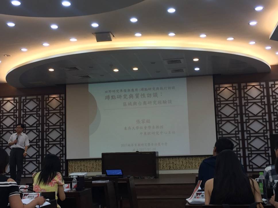 同样精彩并引得课堂上笑声不断、课堂下热烈提问的是台湾本土教授、社会学研究专家张家铭老师为大家带来的“田野研究准备与运用—蹭点研究与质性访谈:区域与台商研究经验谈”课程。他以自己多年来进行的实地考察与深入访谈的经验,告诉大家做学问进行田野研究的重要性,让同学们身受启发。
