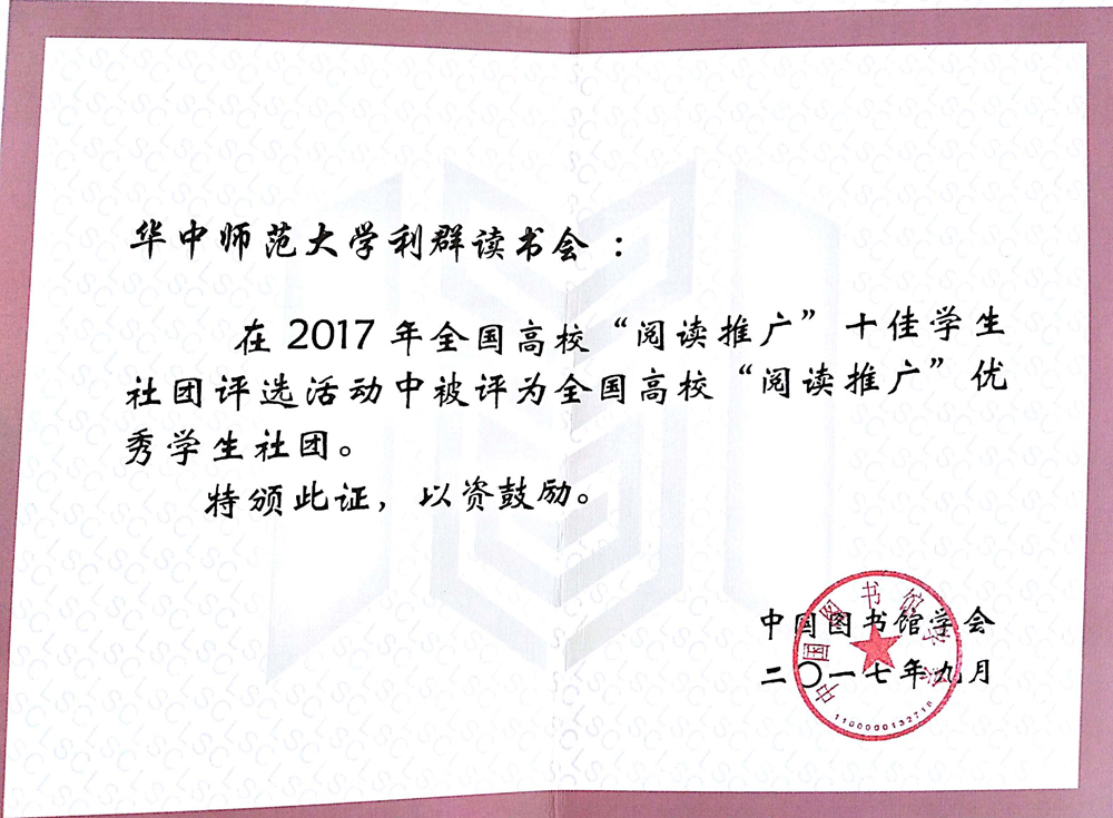 (通讯员:陈质晶)9月27日,在沈阳师范大学举行的第二届全国大学生阅读推广高峰论坛上,举行了全国高校“阅读推广”优秀社团颁奖仪式,政治与国际关系学院研究生社团——利群读书会获颁全国高校“阅读推广”优秀学生社团。读书会成员、博士生庄飞能同学出席了此次会议并接受证书。