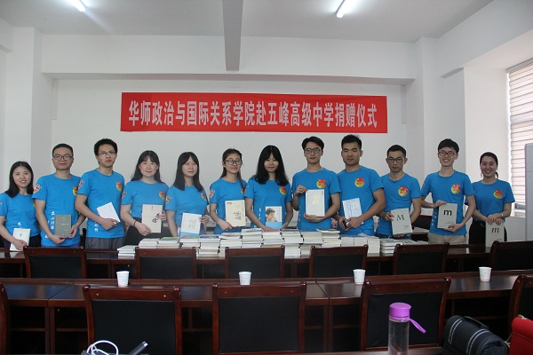 最后,胡院长代表华中师范大学政治与国际关系学院向五峰一中捐赠价值4000余元的图书。仪式上,双方领导亲切握手,均表示今后要加强互相理解和沟通互联,以实现双方更好地发展。“知·行”暑期实践队第一站活动圆满结束。
