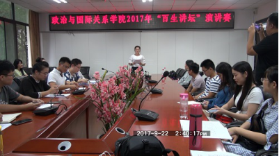 9月22日下午,我院在学院309会议室举行了2017年“百生讲坛”演讲赛,我院本科生辅导员孙延松、研究生会主席张德林、2017级各支委书记、组织委员出席了此次演讲比赛并担任评委。