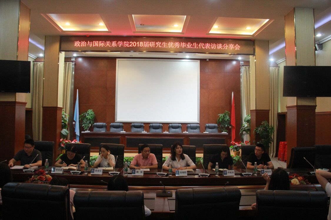 (通讯员 陈质晶)6月8日下午,政治与国际关系学院2018届研究生优秀毕业生代表访谈分享会在模拟联合国实验室顺利召开。本次交流会有幸邀请到将于武汉工程大学就职的颜欣博士、考取复旦大学博士研究生的黄冰琼、考取中共中央党校博士研究生的胥苗苗、考取中国人民大学博士研究生的杨家庆和考取湖北省襄阳市选调生的胡延睿,与我院2016级、2017级全体研究生分享他们在考博、就业等方面的经验,我院团委书记、研究生辅导员骆婉婷主持此次分享会。
