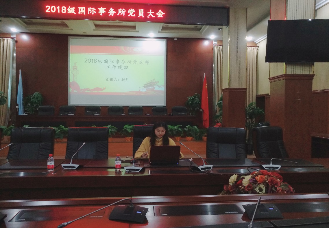 为深入学习贯彻习近平新时代中国特色社会主义思想,推“两学一做”学习教育常态化制度化,提升基层党组织组织力,严格党员教育管理监督,应中共华中师范委员会要求,中共华中师范大学政治与国际关系学院2018级国际事务所支部委员会于2018年3月12日下午在文华公书林四楼模拟联合国实验室开展党日活动,活动由支部书记杨丹主持,支部全体党员参加。这次活动包含两方面的内容:开展党支部组织生活会和开展民主评议党员。活动主题为:强化创新理论武装,树牢“四个意识”、坚定“四个自信”、坚决做到“两个维护”,争做新时代合格党员,勇于担当、务实重行,进一步发挥基层党组织战斗堡垒作用和党员先锋模范作用,为学校“双一流”建设提供坚强组织保障。