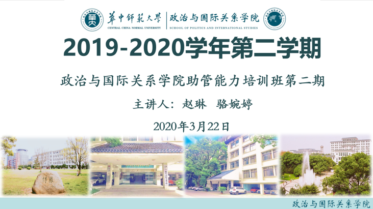 (通讯员:陶冶)为提升助管线上办公能力和综合素养,3月22日下午14点,政治与国际关系学院依托腾讯会议网络平台,对学院31位助管进行了本学期第二次助管能力线上培训。本次培训由政治与国际关系学院研究生教学秘书赵琳老师、研究生辅导员骆婉婷老师主讲,研究生辅导员张正主持,学院全体助管学生参加。