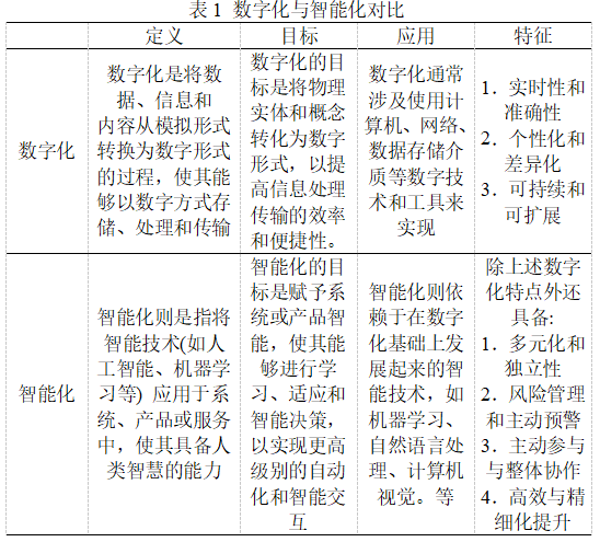 当前,以智能技术为主要代表的第四次工业革命在全球范围内掀起了一股社会革命的浪潮。这与中国式现代化道路的“第五个现代化”——国家治理体系和治理能力现代化相适应,共同凸显中国治理模式在智能化时代的引领发展。所谓“智能化”,就是“数字化”的升级转型(具体如表1所示),它激活数字化记录、收集、保存基因,对数据进行整合、甄别、分析、判断,从而为人类进一步提升治理效率。相较于“数字化”来说,“智能化”具备多元化、独立化、高效化、精细化特点,这些特点为中国智能化治理提供依据、创造条件。它契合国务院印发《新一代人工智能发展规划》中提到的智能化发展“三步走”战略规划:到2030年,我国的人工智能理论、技术与应用总体达到世界领跑水平的“三步走”目标。为实现中共中央、国务院印发《数字中国建设整体布局规划》中提出的发展高效协同的数字政务,应以数字化驱动生产生活和治理方式变革的规划与要求,注入强大动力。“智能化”与国家治理现代化紧密结合,主要体现在人工智能、大数据、区块链等为标志的程序智能应用上,共同强化国家的刚性治理。从“互联网+”到“智能+”,体现了基于数字革命的人工智能技术对社会生产的全新赋能,有利于“完善网格化管理、精细化服务、信息化支撑的基层治理平台”。实现社区治理智能化,其本质上是在社区治理领域运用和体现当代科学技术;人们通过智能化手段,为城市社区治理的赋能提供强大动能,催生一批“未来社区”的典范,如浙江杭州滨江“一体化整体智治”缤纷社区、江西九江“AI智慧助力社区治理”华声社区、湖北武汉枫桦“‘数字社区’——治理从‘脚下’到‘眼前’”苇岸社区等。