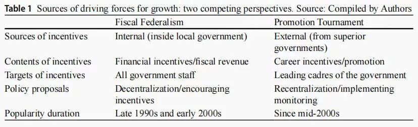 从上述分析可以看出,财政联邦主义认为增长的动力源自地方政府内部,而晋升锦标赛理论则认为地方政府推动增长的动力来自外部考核。识别中国地方政府推动经济增长的激励来源至关重要,因为这导向了截然不同的政策建议:财政联邦主义提倡更多的权力下放和加强对地方政府的激励引导,而晋升锦标赛理论则建议进一步的中央集权和中央政府的严格管控。本文将两种解释中国经济增长理论的主要特点总结于表1。