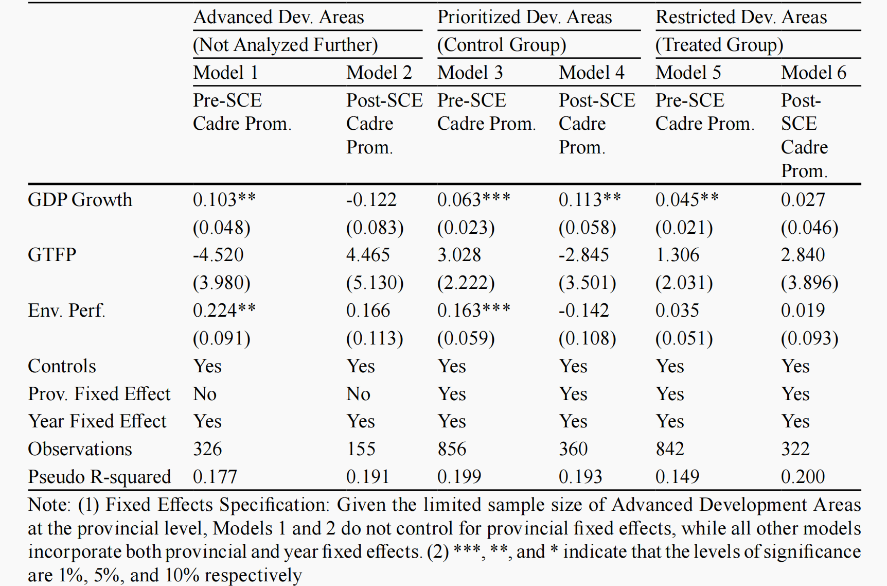 作者首先使用有序Probit模型,考察分类考核是否在地市层面得到落实。在这一阶段,因变量为市委书记是否晋升。自变量为其任内的经济绩效(以GDP增长率的移动平均值衡量)。控制变量主要包括:(1)其他绩效评估指标,如发展质量和环境绩效;(2)干部特征,如年龄、学历、任期等;(3)地方禀赋,如人口规模。另控制了省份和年份的固定效应。