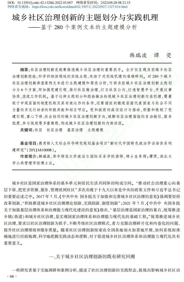 社区治理创新作为统筹推进城乡社区治理的重要抓手,其创新经验的完整梳理和实践动态的精确把握,对于推进城乡社区治理体系和治理能力现代化具有重要的意义。韩老师的这篇文章系统回溯了既有的研究经验和创新案例,阐明了归纳城乡社区治理创新实践主题的必要性。因此,该文章溯本求源,统计了280个较为典型的研究样本并对其进行聚类分析和主题建模,以期完整、全面、准确地展现典型样本案例的实践全貌,并在此基础上将城乡社区治理创新的主题划分为6个方面,从而更好地审视其实践机理和所蕴含的内在逻辑。全文脉络明晰,结构严谨,对于研究探讨城乡社区治理创新问题必将发挥建设和引领性的作用。